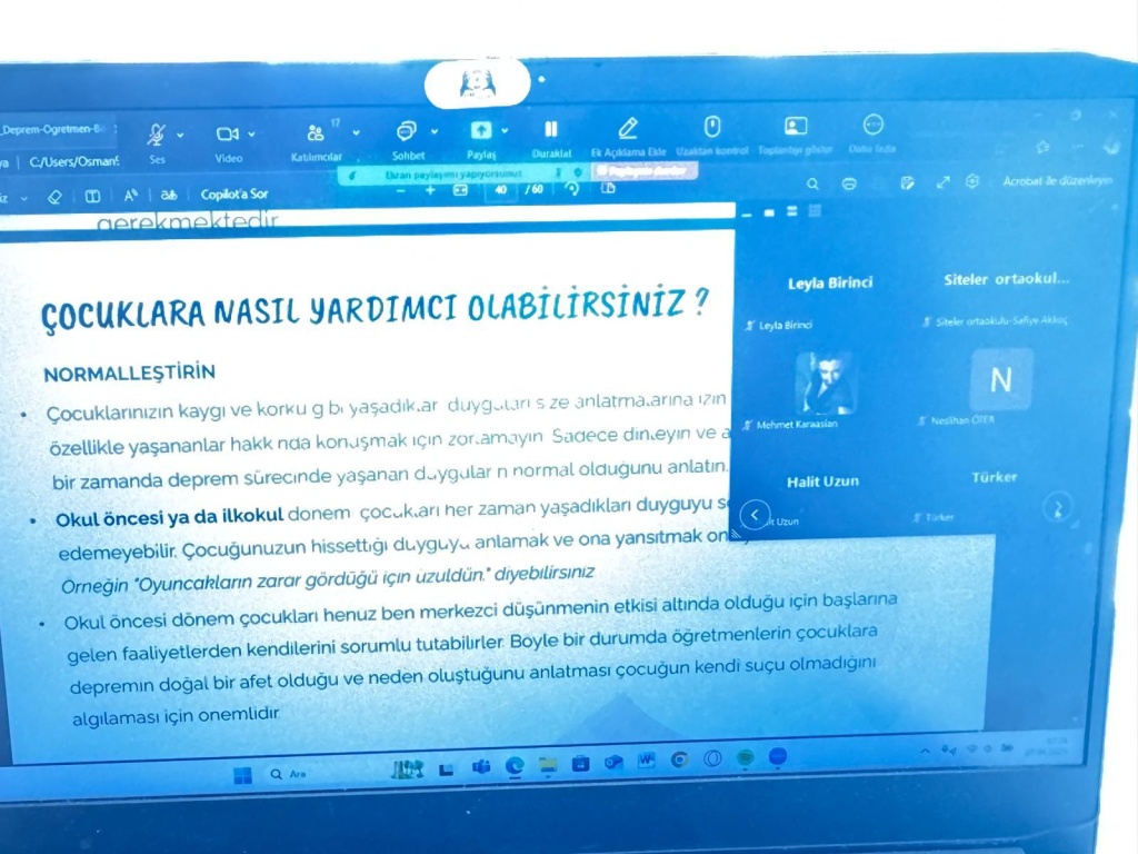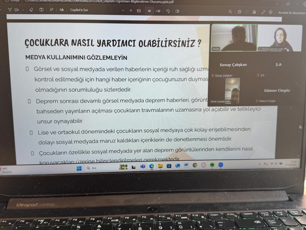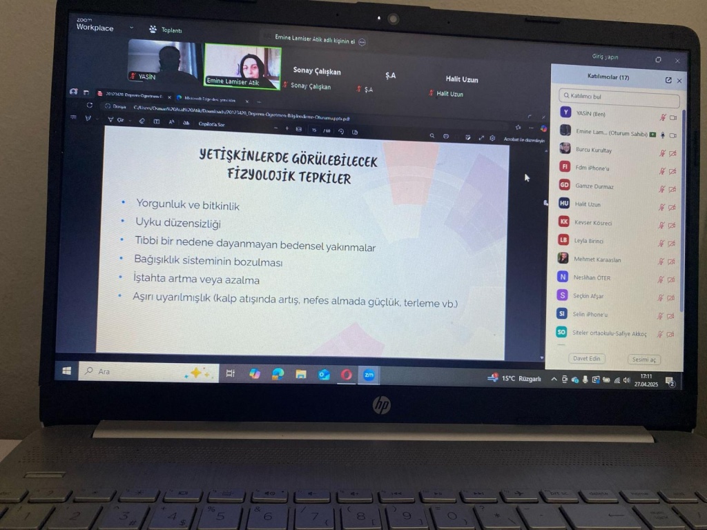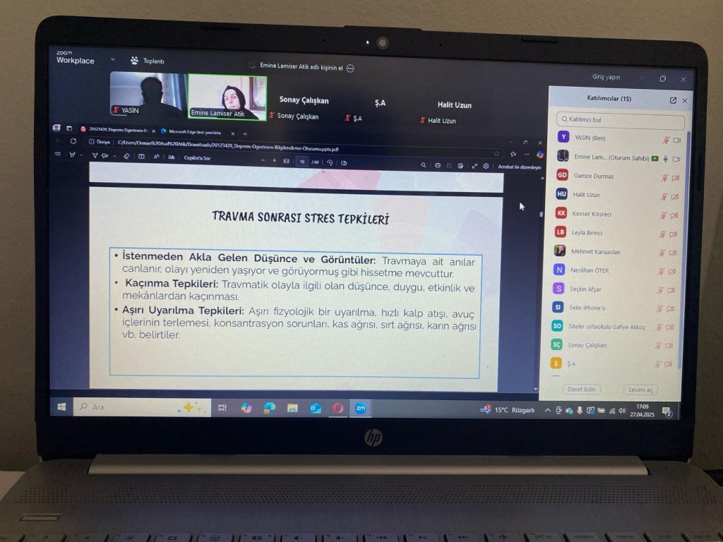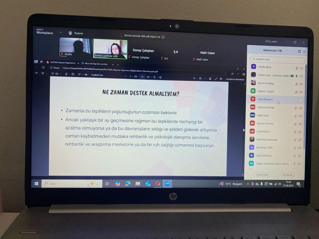 27 Nisan günü rehberlik servisi tarafından psikososyal müdahale çalışmaları -Deprem- kapsamında okul öğretmenlerimize Zoom üzerinden seminer verilmiştir.